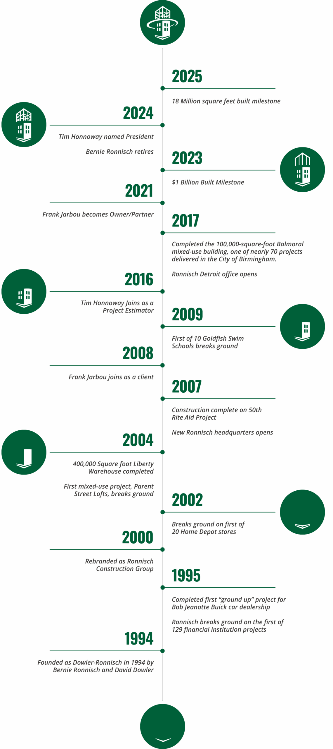 Founded in 1994 as Dowler-Ronnisch by Bernie Ronnisch and David Dowler, Ronnisch Construction Group has grown from a local builder into one of Michigan’s most trusted construction management firms. Early success with ground-up automotive and financial institution projects helped establish a strong foundation, including what would become 129 financial institution builds across the region.